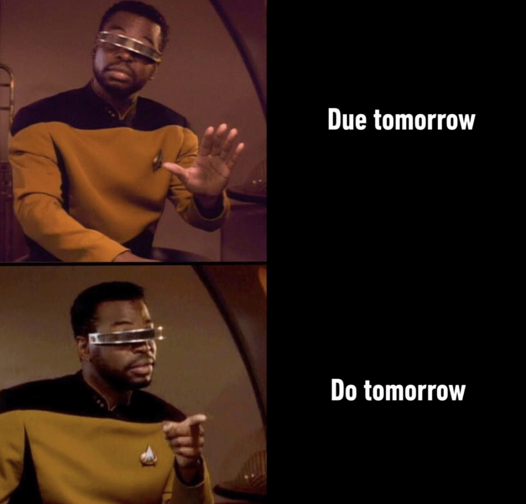 The central part of the joke is that ‘Due’ and ‘Do’ are homophones and sound the same when spoken. But in this case, they have nearly opposite meanings. It’s funny because we can relate strongly to both hating deadlines and procrastinating. We feel so strongly in fact that the hand gestures just don’t seem expressive enough. It’s a goofy thought to wave your hand at deadlines like you were passing on cranberries at Thanksgiving.