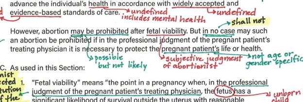 These markups do a lot of lexical work. The people responsible for designing this mailing spent care on creating impact with each of their words. The picture they paint using markers and highlighters is gruesome, but luckily, it’s also not reality. Replacing “fetus” with “unborn child” and using terms like “abortionist” makes us think of late-term coat-hanger abortions but in fact, the amendment seeks to incentivize safe abortion and leaves a path for lawmakers to immediately outlaw late-term procedures.