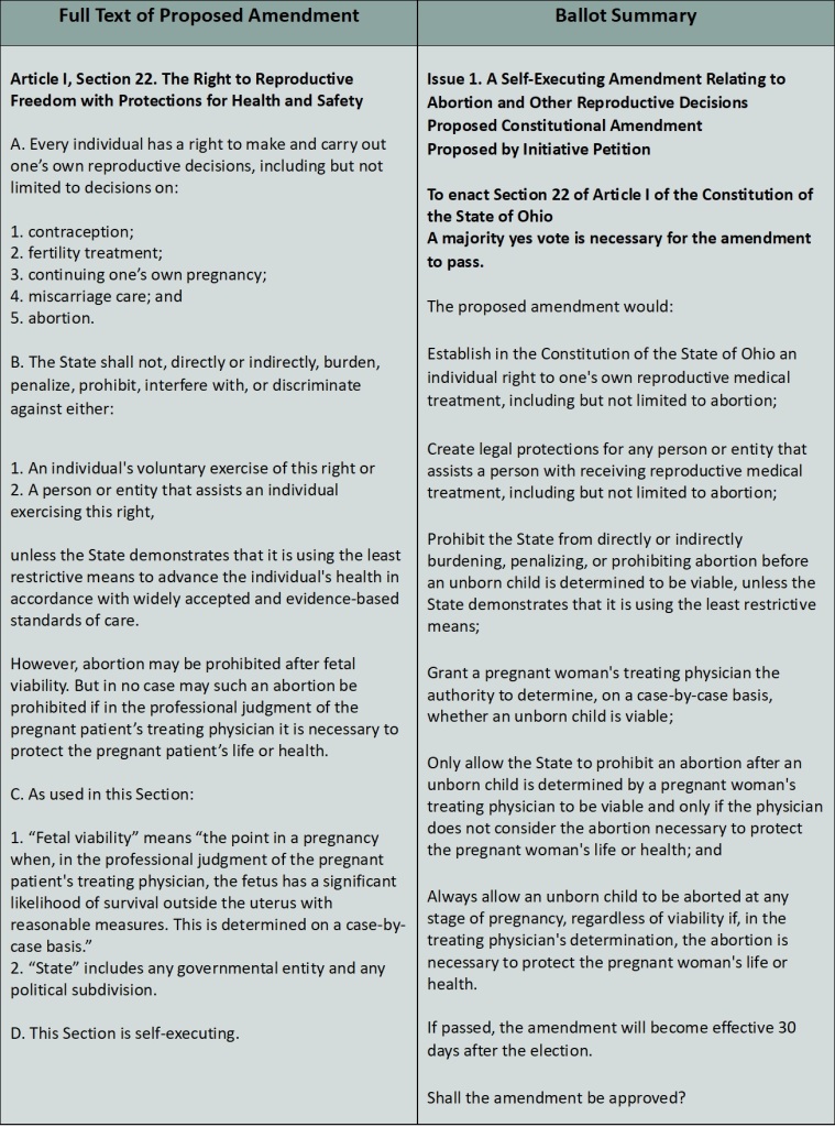 - Issue 1 – seeks to amend the Ohio constitution by adding a right called The Right to Reproductive Freedom. This freedom protects access to contraception, fertility-related decisions, abortion with provisions for future restrictions on abortion, and healthcare such as post-miscarriage care.
