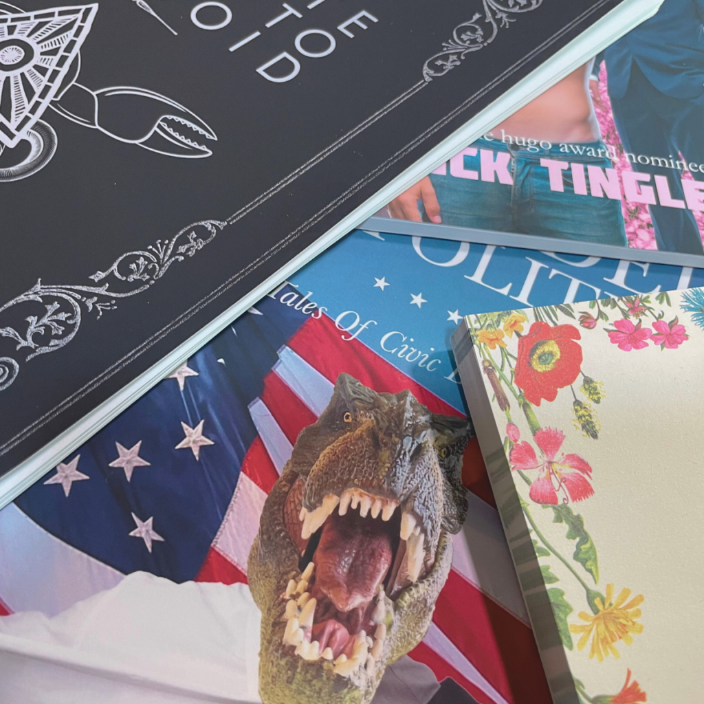 Clearly irrelevant, but, on a basic level, I gotta know: does the text honor the title? To give you an idea of where my curiosity comes from, one of the books is a political thriller romance, and on the cover is a buff man with a dinosaur head and an American flag in the background. I won’t share the title.